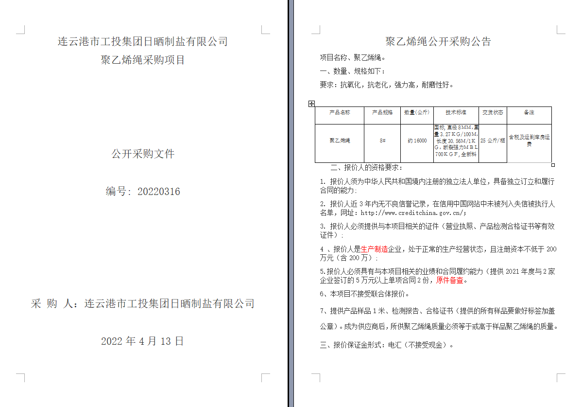 连云港市工投leyu(中国)日晒制盐有限公司聚乙烯绳采购项目