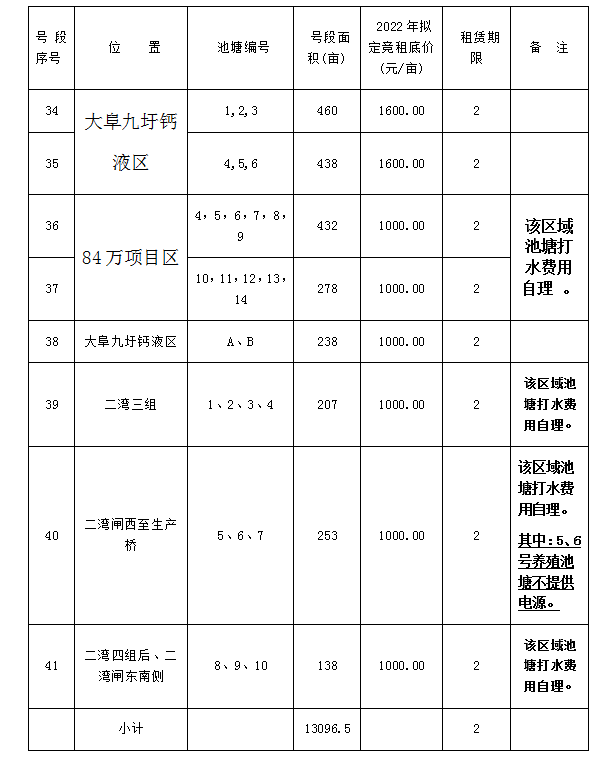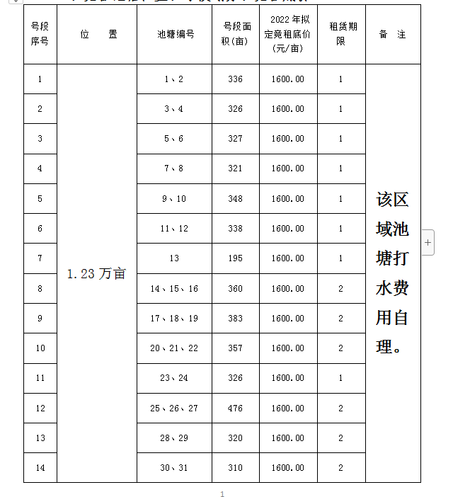 一、竞租池塘位置、号段划分、竞租底价