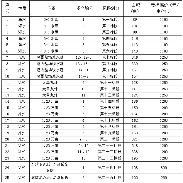 三、竞租池塘各标段竞标底价: