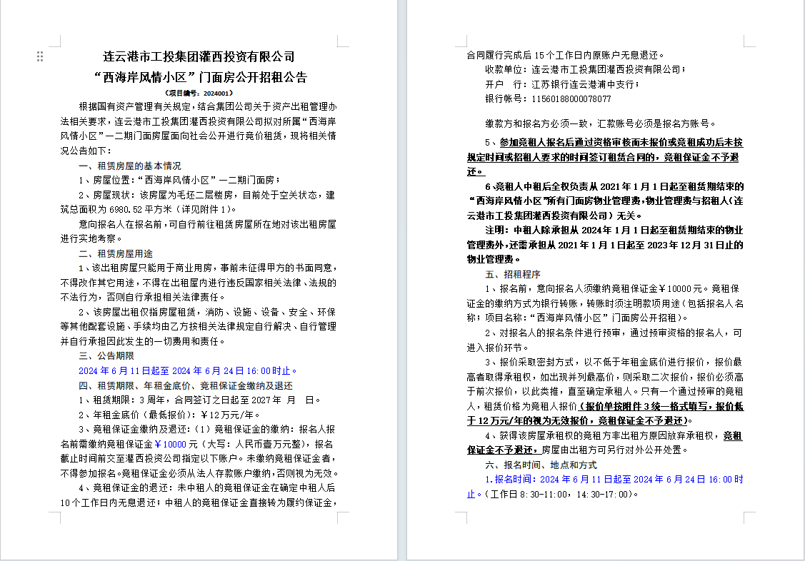 连云港市工投leyu(中国)灌西投资有限公司“西海岸风情小区”门面房公开招租公告
