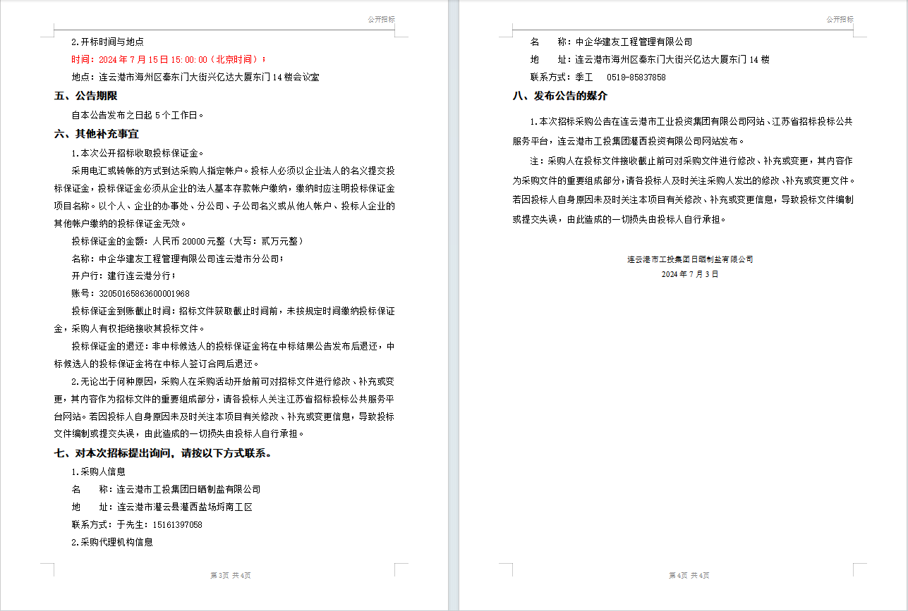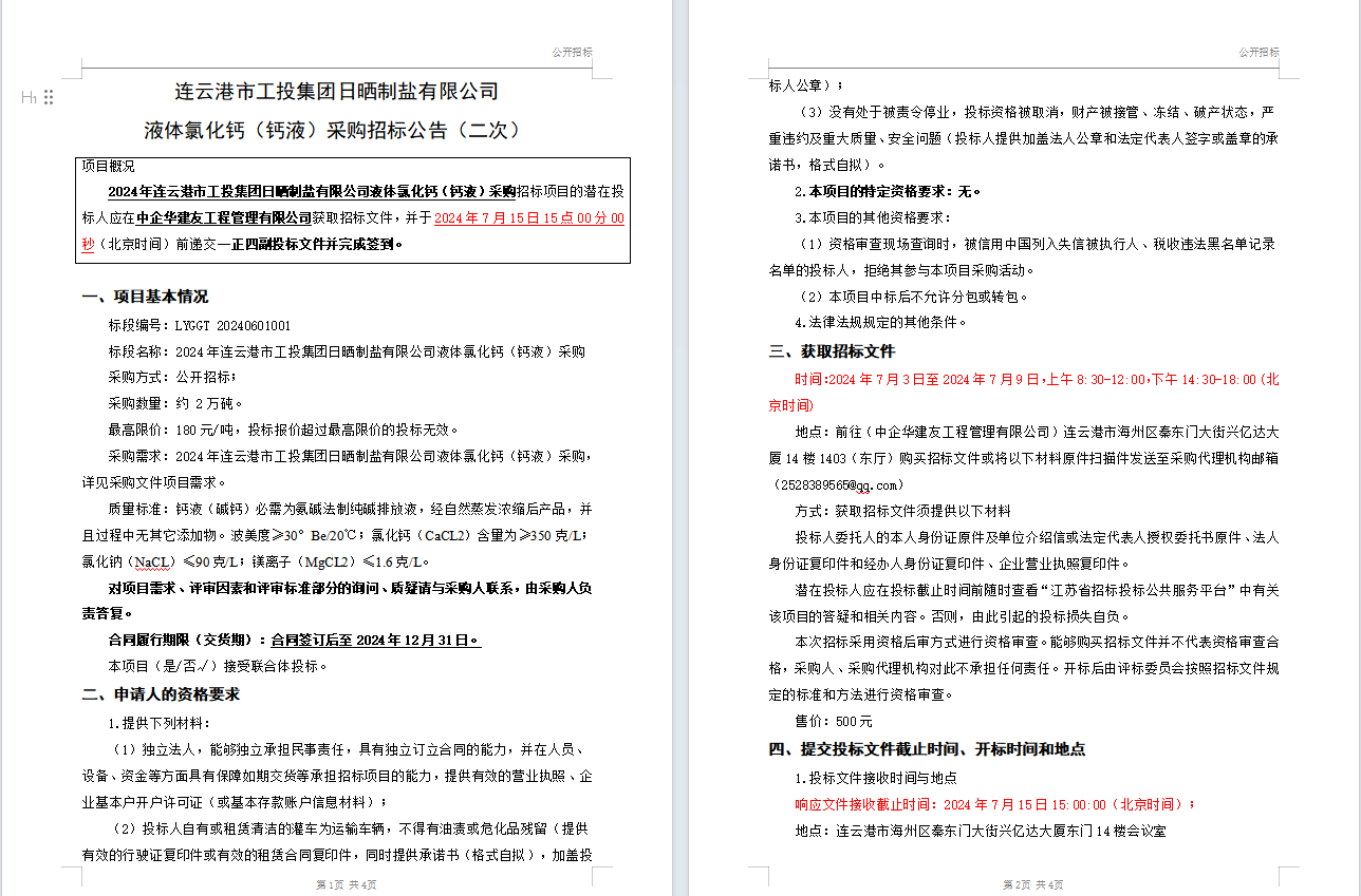 连云港市工投leyu(中国)日晒制盐有限公司液体氯化钙(钙液)采购招标公告(二次)