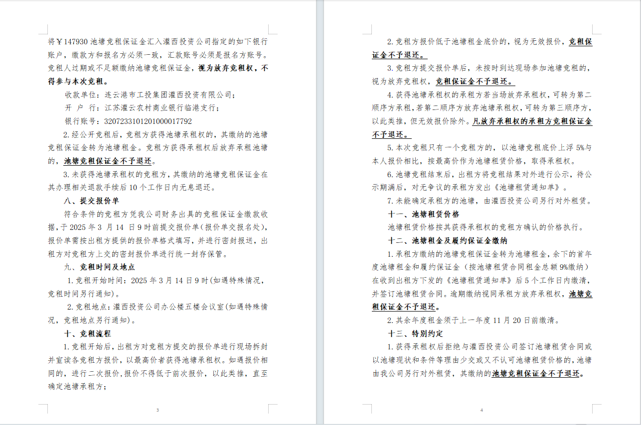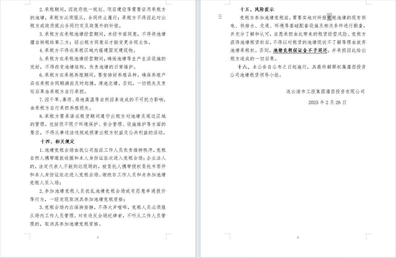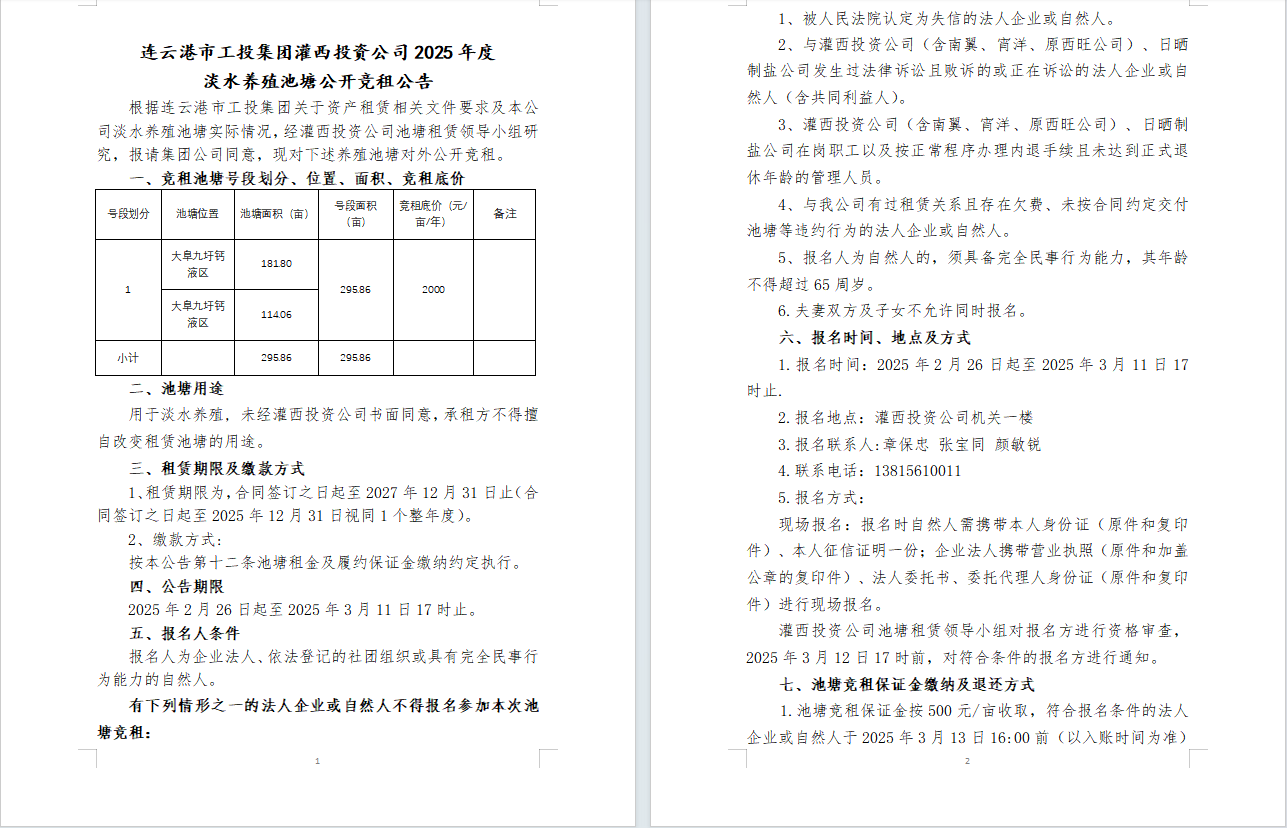连云港市工投leyu(中国)灌西投资公司2025年度淡水养殖池塘公开竞租公告