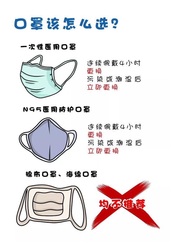 选择二:去医院看病或人群密集处可选用N95医用防护口罩,连续佩戴4小时更换,污染或潮湿后立即更换。