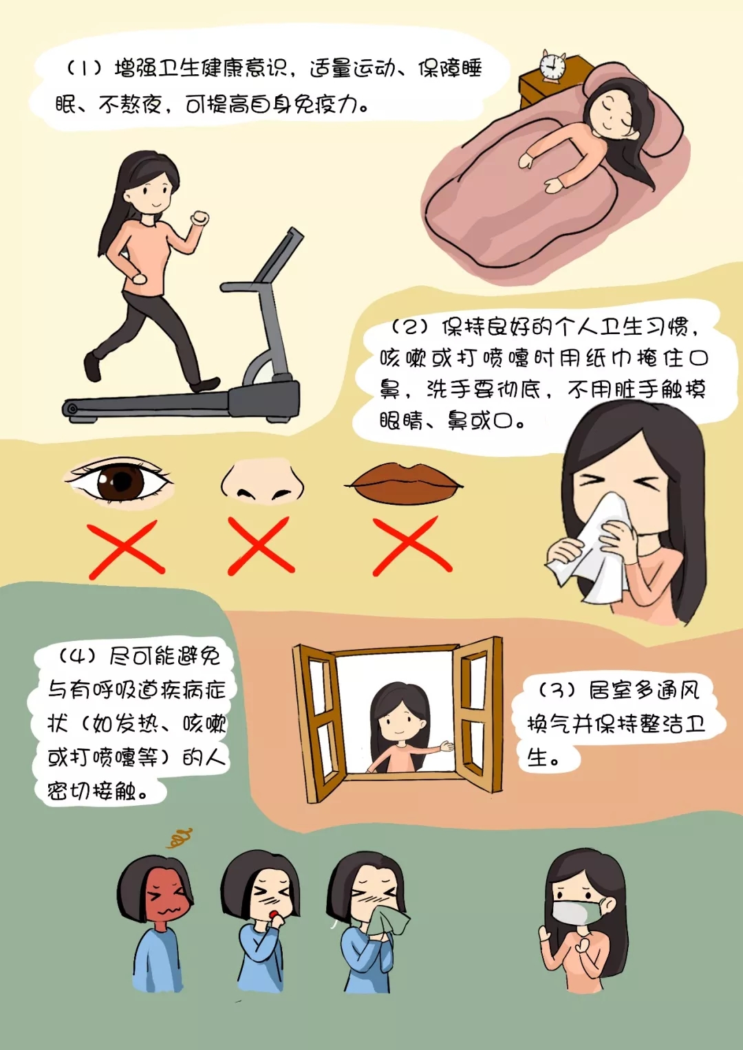 (1)增强卫生健康意识,适量运动、保障睡眠、不熬夜,可提高自身免疫力。