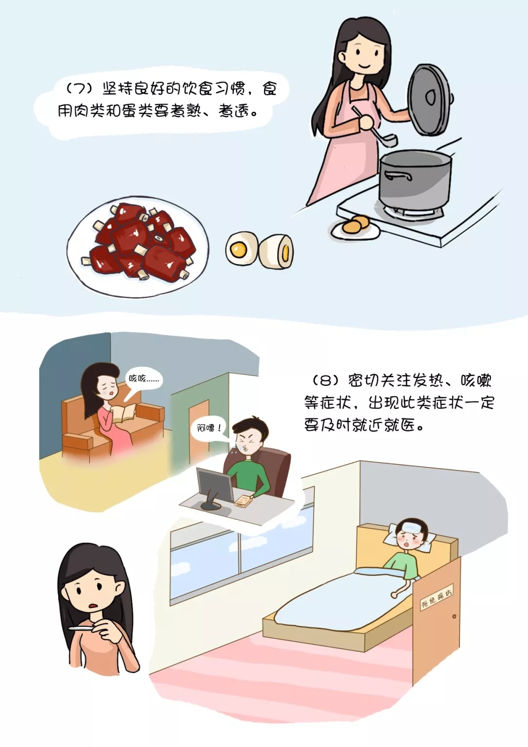 (7)坚持良好的饮食习惯,食用肉类和蛋类要煮熟、煮透。