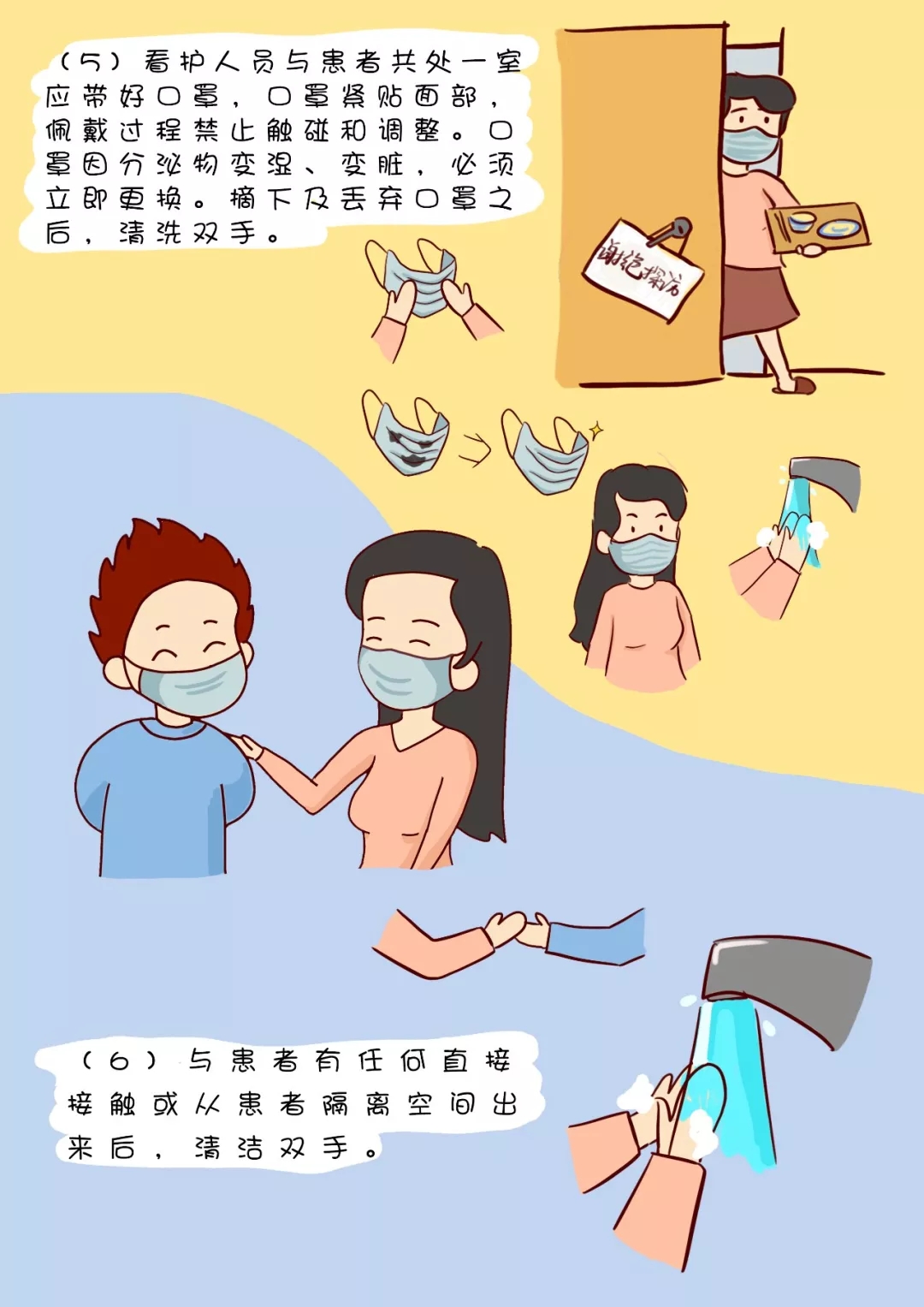 (5)看护人员与患者共处一室应带好口罩,口罩紧贴面部,佩戴过程禁止触碰和调整。口罩因分泌物变湿、变脏,必须立即更换。摘下及丢弃口罩之后,清洗双手。