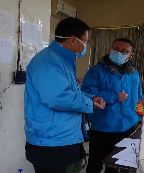 李忠祥检查门卫进场人员测体温情况(左一)
