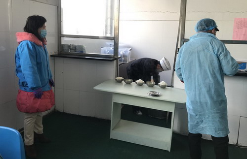 齐欣梅检查职工食堂午间就餐情况(左一)