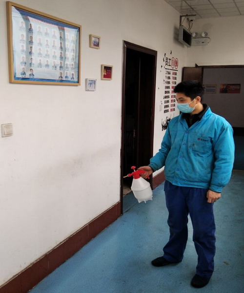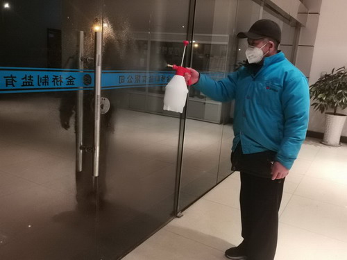 孙正柱为办公楼入口进行消毒