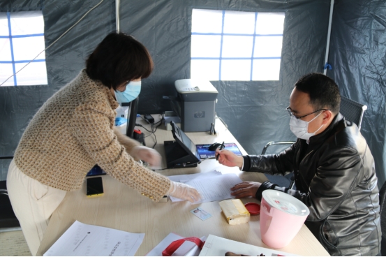 4月6日,工投金融板块复工的第一天,来办理业务的人员发现,公司院内树立着一顶崭新的帐篷,电脑、桌椅、打印机等办公设备放置其中,酒精、免洗液、口罩等防疫物资摆放在帐外醒目位置。 这是工投金融板块为保证疫情期间疫情防控与业务服务两不误,专门打造的特色“防疫业务服务窗口”。 正值疫情期间,而金融板块的业务涉及面广,流程严谨,尤其是窗口业务所涉及的签字、盖章等环节都需要与外来人员面对面现场办理,如何化解因疫情而产生的业务开展难题,就成为摆在金融板块干部职工眼前的一大问题。