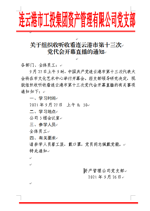 关于组织收听收看连云港市第十三次党代会开幕直播的通知