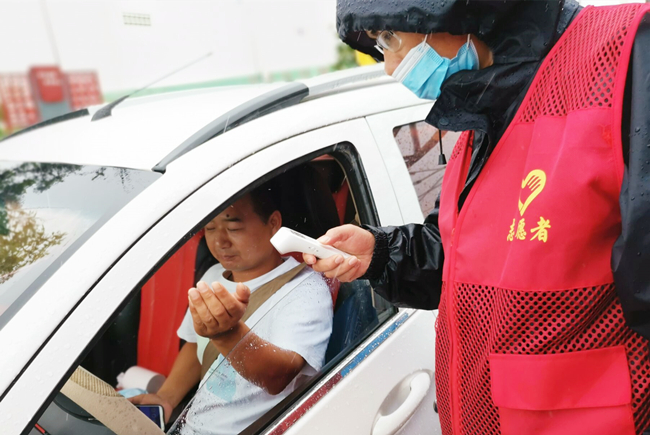 “您好,请出示一下行程码,做下登记。”坚守在岗位,逆风迎雨,对车辆进行逐一登记和体温检查,丝毫没有受天气的影响。