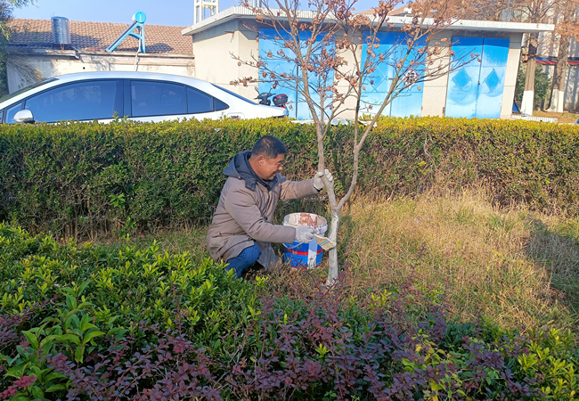 随着天气慢慢转凉,为了减少绿化树木病虫害发生,泰祥公司对场区绿化树木开展冬季“涂白行动”,为保护绿化树木越冬做好准备。