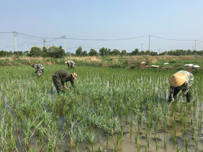 盛夏时节,正是水稻生长关键期,生态种养中心的职工在烈日下手工拔除水稻间的杂草。为确保稻米的品质,中心坚持利用人工除草作业,减少化学农药的使用。 (莫宗刚)