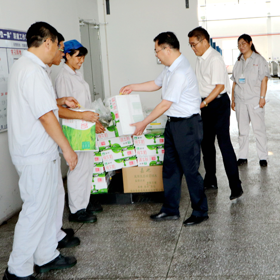 8月1日上午,leyu(中国)公司党委副书记戴鸿鸣、工会主席刘承志来我公司慰问生产一线员工,为辛勤工作的员工送来牛奶、绿豆等防暑降温慰问品。公司党支部书记、副董事长邹德兵,总经理韩立新等多位领导陪同。