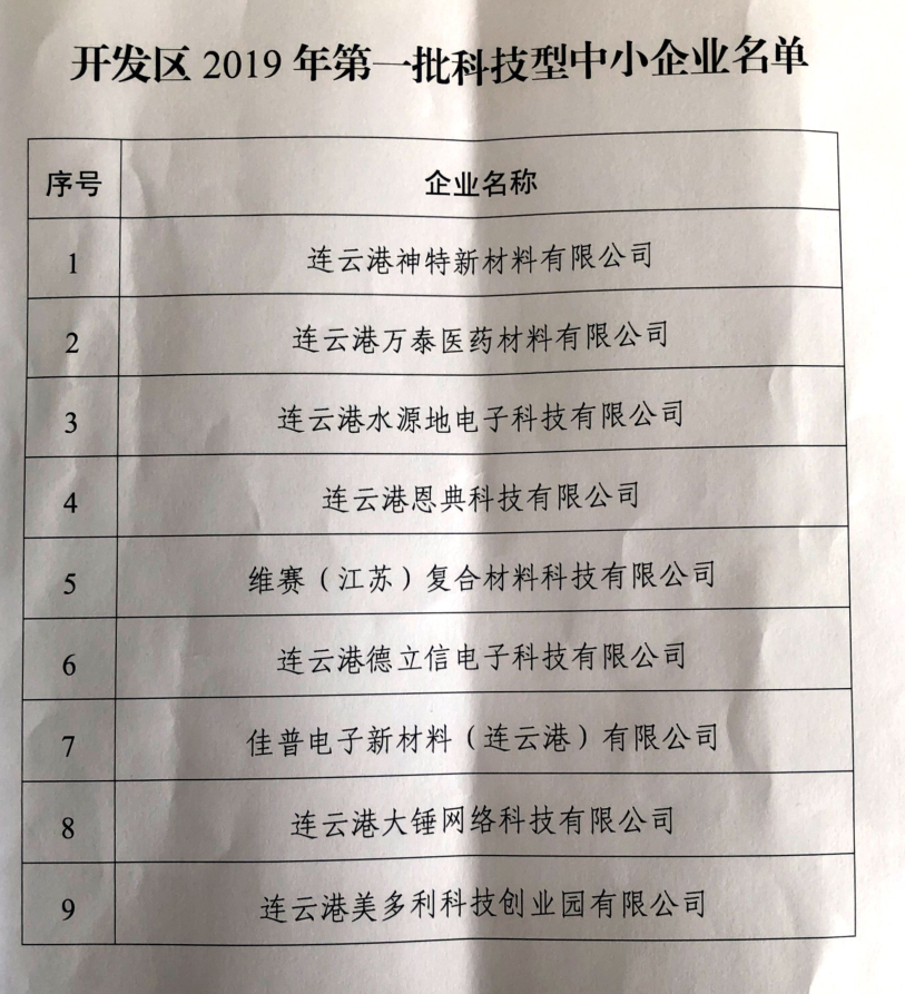 近日,公司被经济技术开发区管委会认定为“2019年第一批科技型中小型企业”。