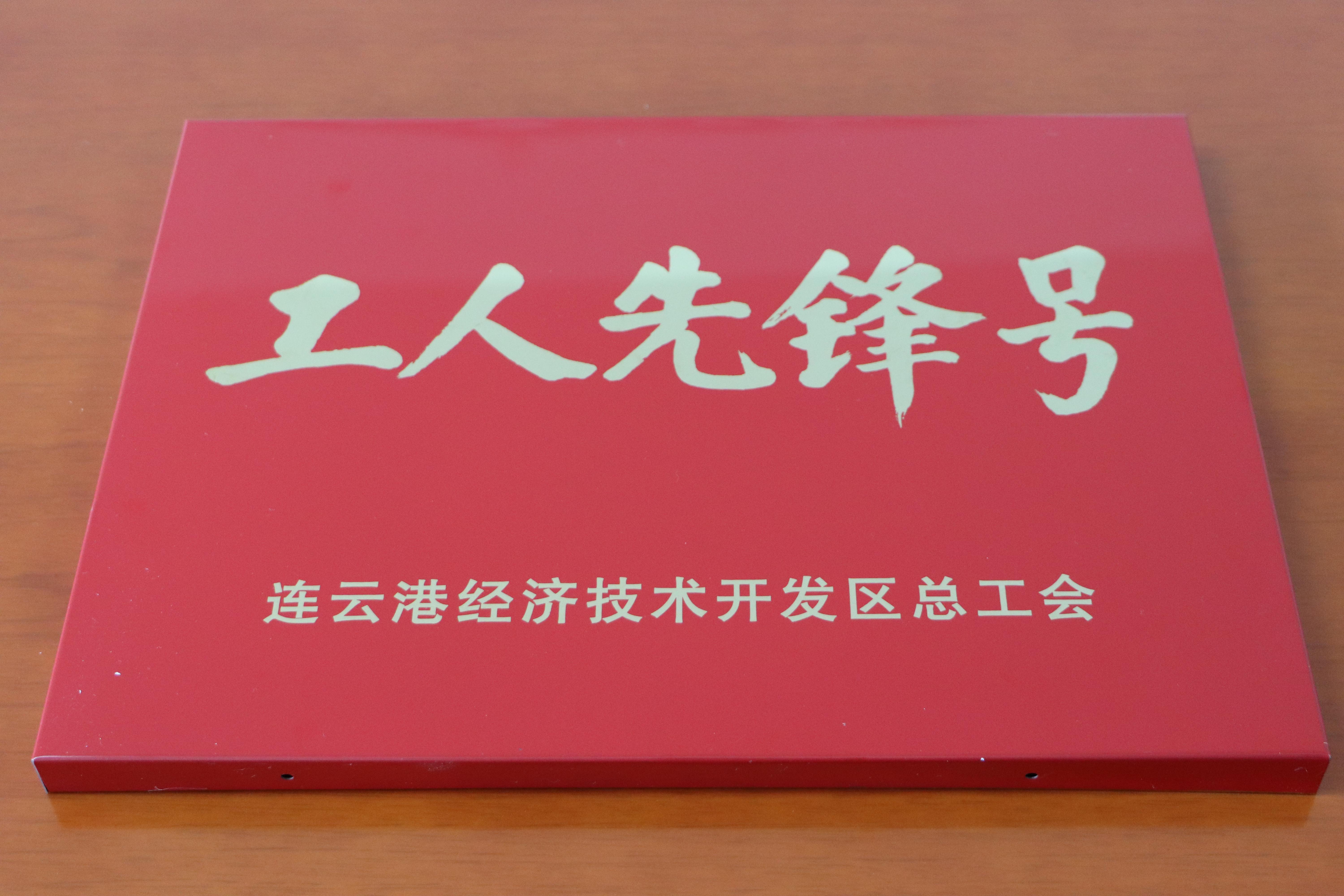 近日,公司捷报频传,自生产线一名员工被授予市劳模称号后,5月11日上午,公司又从猴嘴街道办事处工会领回奖牌,公司生产丙班被授予“连云港经济技术开发区工人先锋号”。