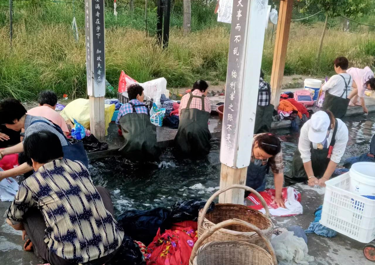 想到这些,我很好奇的查了查这个地方,原来洽川之前的洗衣沟渠被新规划占用,他们重新选址建设了这个关雎洗衣文化长廊。通过打一眼温水自喷井,用青石堆砌一条宽3米、长30余米的青石洗衣渠道,并且搭设了木结构的文化长廊,来保护当地特有的洗衣文化。