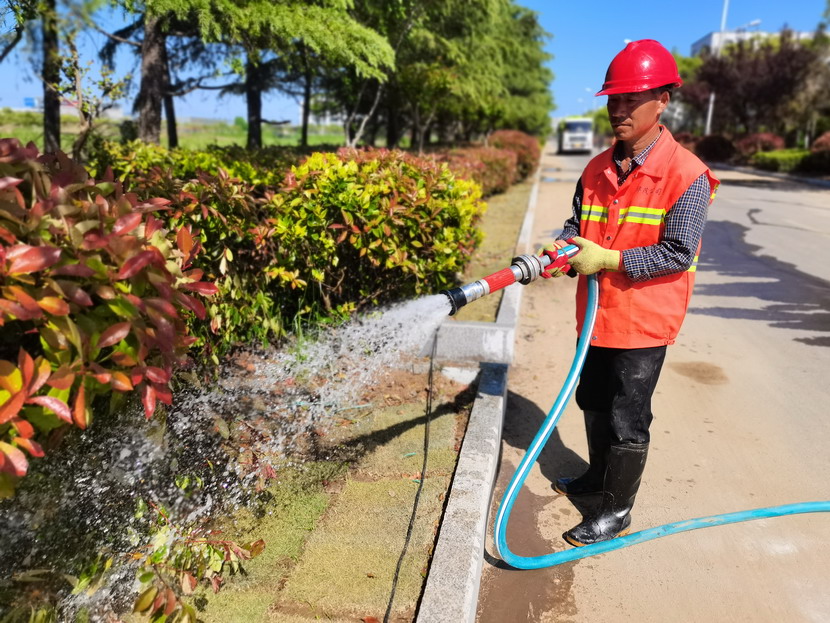 在各条基础养护路段,绿化工人正在浇水,为花草树木“解渴”。尤其是刚移植的苗木和刚出土的青苗,气温较高,容易造成脱水。通过适度浇水,保持土壤湿润,促进植物根系吸收土壤中的养分,有助于生长和扎根,提高绿化成活率。