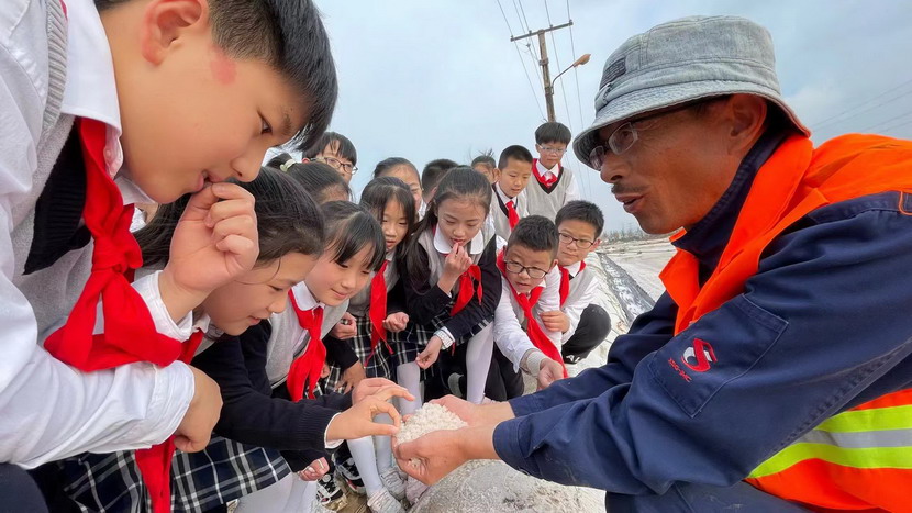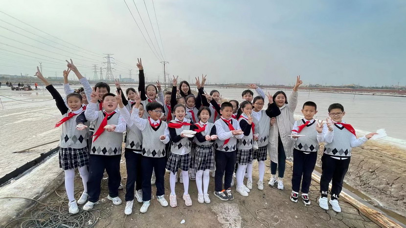 同学们近距离感受淮盐的生产过程,听老盐工讲述过去收盐的故事。为了感受盐工的辛苦,同学们还兴致勃勃地穿上胶鞋,来到盐池中,用耙子扒盐,用铲子将结晶的盐堆成堆,用手触摸盐的质地,观察盐的结晶形状……同学们不禁感慨小小盐粒的来之不易。