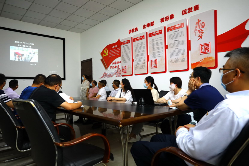 与会人员边看边听讲解海州湾党支部规范化展板和本月书记项目的落实情况,以及在海州湾党建活动室观摩学习了上半年党建基础台账和活动影像。各党支部就基层党组织规范化及书记项目“点将台”的落实情况作了汇报交流。党委副书记杨善革针对各支部的党建工作情况作了详细的点评,指出各支部党建工作中存在的不足,并要求各支部立即整改。