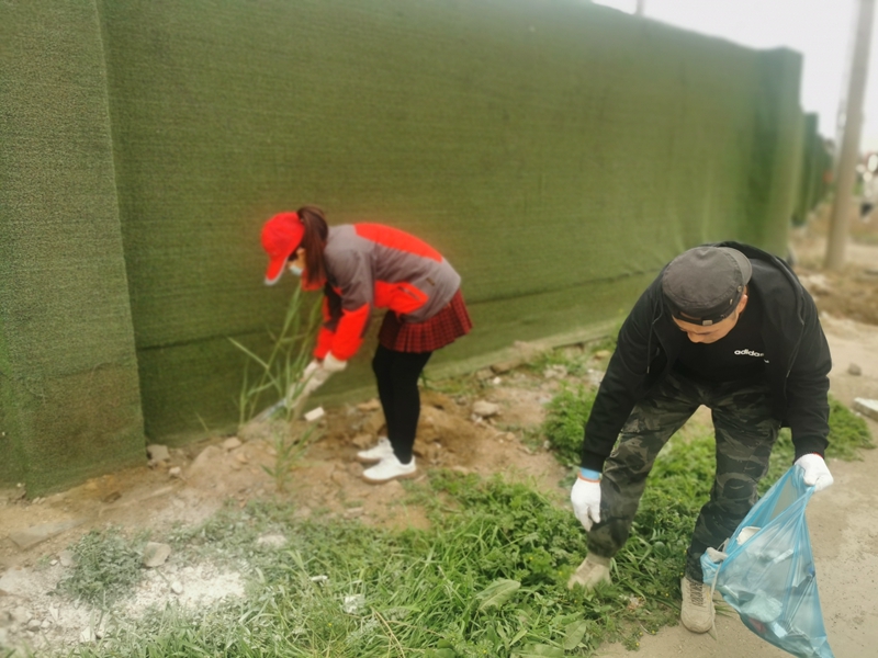 翔立分公司党支部携手海州湾公司党支部对公司的车站小滩进行环境整治,为裸露在外的土地进行防尘网铺设。