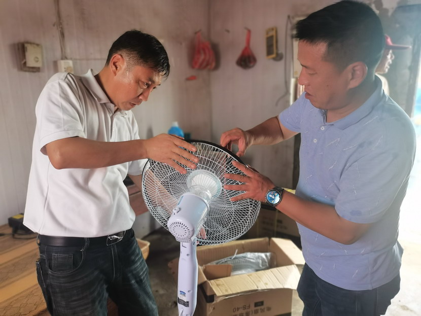 15台风扇陆续送至“先锋、昌圩、大浦”三个矿盐班组,公司领导一边亲手为职工进行安装,一边与他们亲切交谈,详细了解职工需求,充分肯定他们不畏艰辛、吃苦耐劳的奉献精神,叮嘱他们做好防暑措施,保障身心健康,同时保障生产作业安全平稳。