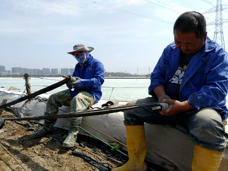 因矿盐卤水清,结晶速率快,在长盐的过程中极易附着于浮板上,增加了浮板的重量,不利于浮板的漂浮,严重影响塑布的收放,急需将原1680公亩钙盐结晶池里的浮板进行更换,共28条,2800米。为了效益最大化、成本最小化,大浦工区回收3、4、14、15班已征结晶池的旧浮板进行晾晒,并利用废旧的塑布进行同规格的裁剪包裹在浮板上,程序繁琐,工作量巨大。东滩的15名员工加班加点,抢抓有利天时,确保雨季到来之前塑布收放正常,多产盐、产好盐,促进春晒制卤确保原盐生产良性运转夯实基础。