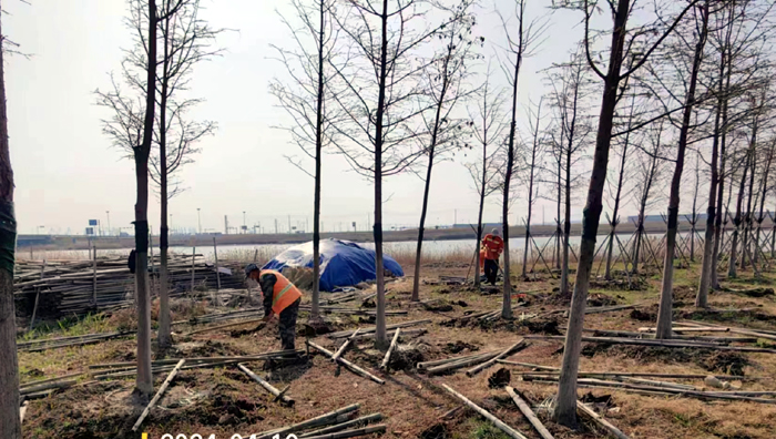 积极浇灌返青水。当前,地温回升快,苗木易萌芽,该班组采用“人工+机械”相结合的方式,全面启动返青水集中浇灌工作,重点对园区乔木、果木、草坪等进行全面灌溉,促进苗木、草坪返青发芽。按照分种类、合理浇灌的原则,采取集中浇灌的方式最大限度减缓昼夜温差对绿化植物的影响,入春后共浇水100余次,对落羽杉圆动力灌根2000棵,对大树浇水1500棵,绿化浇水约30000平方米。