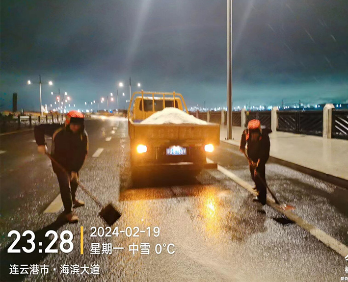 该公司迅速启动突发天气应急保障预案,近30余名道路应急排险突击队员,在公司统一按排下 ,装车备运融雪盐斤近15吨,现场工作中队员们士气高涨,无所畏惧。夜间8时左右,10余名党员先锋,兵分三路再次安全有序奔赴烧香河、海滨大道、228等路段桥梁,无惧大风夹着冰雨颗粒吹打脸颊,两人一对、三人一组、挥动手中铁铣,汗水与冰雨湿透橙色衣衫,经过近4个多小时努力奋战,人工撒放融雪盐斤近20余吨,高质高效保障近30座桥梁安全通畅。