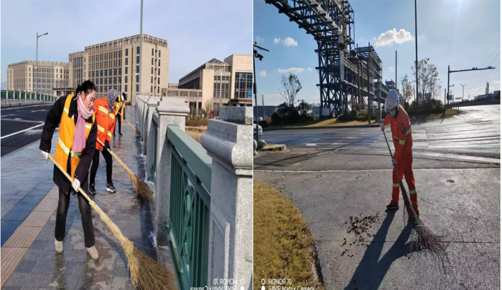 人工保洁“无所畏惧”。该分公司9个班组100多名保洁人员每天在班长的带动下,无惧徐圩海风吹透身体,尽管手冻僵了,仍然挥动手中扫把清扫园区辅道落叶、泥土1500多米长,清倒各种果皮箱300多个,转运各类生活垃圾500多包,清洗站台20多个,清除道路坑塘积水30多处,深冬时节道路人工保洁质效再“升温”。