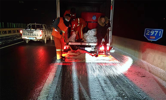该公司除雪突击队由总经理徐习华和副总王利分头带队指挥,集结了安全部、管养部、绿化、保洁、市政、环卫的突击队员80余名,出动5辆皮卡车、3辆皮卡、1台装载机和2辆巡查车,主要负责新区内桥梁、连云开发区桥梁、徐新路、疏港大道、228省道等主要交通干道布撒融雪剂抗冻救灾工作。突击队员在进行融雪剂撒布作业的同时,及时清理路面融化雪水,防止再次结冰,各除雪设备配合作业,阶梯式向前推进,提高除雪效率。(李敏 王宜全)