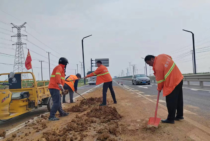 7月27日上午,临近下班之时,该分公司228省道班长姚功,接到公司应急处理电话,疏港大道向西路面近1500多米长,车辆抛洒严重影响往来车辆安全经过。正在下班的途中他二话没说,调转车头奔赴事发地点疏港大道,迅速摆开安全锥,挥动手中铁铣开始突击清理路面上矿土,石块。闻讯得知此事,共产党员纪树好,胡可贵,班组成员孙洪召等同志二话没说,一并赶往现场支援,橙色工作服在阳光照耀下显得格外靓丽。工作现场,遇到大的石块他们就用手搬,小的、碎的就用铁锨和扫把清理,中午的阳光火辣辣的,他们就这样顶着烈日奋战近两个多小时,共转运矿土泥块、石子近10余车,高质高效保障了核心道路车辆安全通行。(杨波)